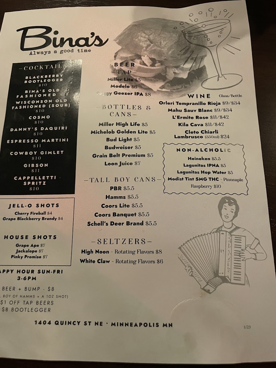 Bina's, located at 1404 Quincy St NE in Minneapolis, MN, is a vibrant dive bar that effortlessly combines a relaxed atmosphere with a delectable food menu. Part of the Centro restaurant group, Bina's offers a charming speakeasy vibe, complete with bar games and quirky decor. Guests rave about its signature Bina burger, likened to a Juicy Lucy, and the crowd-pleasing deviled eggs. While the drink selection may be limited, the overall experience shines through the friendly service and unique ambiance. Whether you're looking for comfort food or a cozy retreat, Bina's welcomes you to unwind in style without breaking the bank.